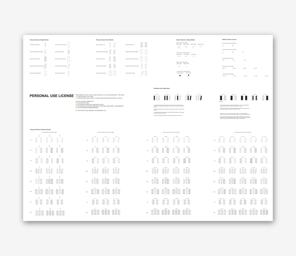 Dozens of graphics in Adobe Illustrator and Affinity Designer formats. Also includes PSD, SVG, and PNG formats that will work in most graphics apps and can be used to make some great-looking wiring diagrams. Pickups, pots, switches, components, and more are covered in the 'Parts' graphics and there's an additional pack of pickup and switch layout graphics that allow you to indicate which pickup is active in which position.